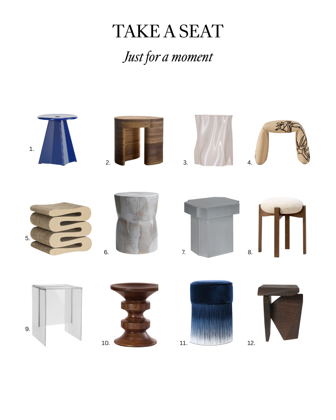 Tabouret Métallique via @livingedge | Curvy Stool by Studio Pneuma via @greatdanefurniture | Lulu Stool by Special Studio via @designstuff | Folded Bench, Flowers by Nanimarquina via @cultdesignau | Wiggle Stool by Frank Gehry via @livingedge | Nimbé 01 by Pascale Girardin via @moebelau | Funki Stool B2 by Louise Rose via @district_au | Pioneer Stool by Frederica via @cultdesignau | Max-Beam Stool by Kartell via @spacefurniture | Eames® Turned Stool, Shape D via @livingedge | Amani Pouf by @moooi | Silva Piece by @fermliving